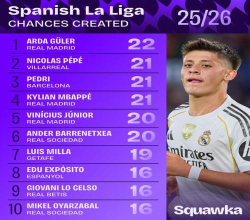 雷速体育10月7报道 外媒统计了本赛季西甲创造进球机会次数排行榜,皇马中场居莱尔以22次居首,尼古拉斯·佩佩、佩德里以21次紧随其后。