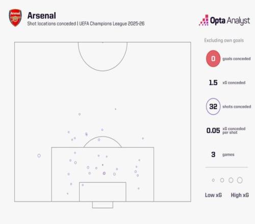本赛季欧冠联赛阶段前三轮,阿森纳三战全胜,打入8球,一球未丢。