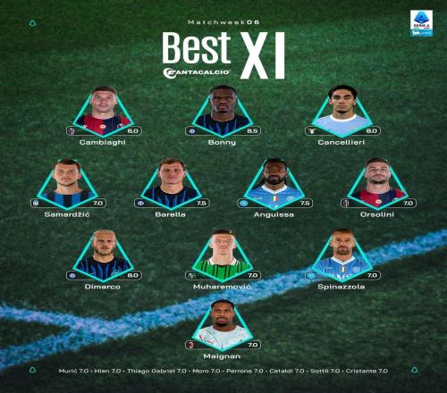意甲第6轮最佳阵容:博尼领衔,国米3人入选,迈尼昂在列