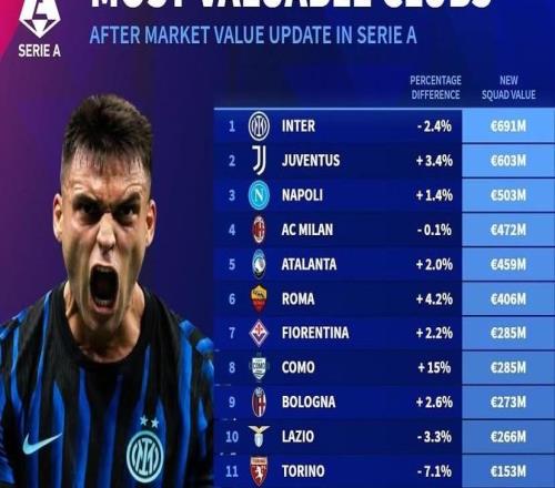 意甲俱乐部身价排名:国米超6.9亿第1,尤文第2,那不勒斯第3